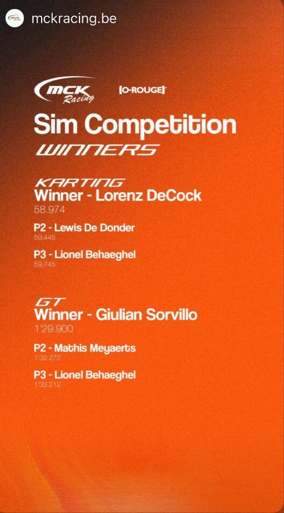 Op de opendeurdag van MCK-Racing waren er 2 race simulators van O-Rouge aanwezig. De eerste was een kart simulator op het circuit van Genk. De tweede was een race simulator met GT auto's op het circuit van Zolder.